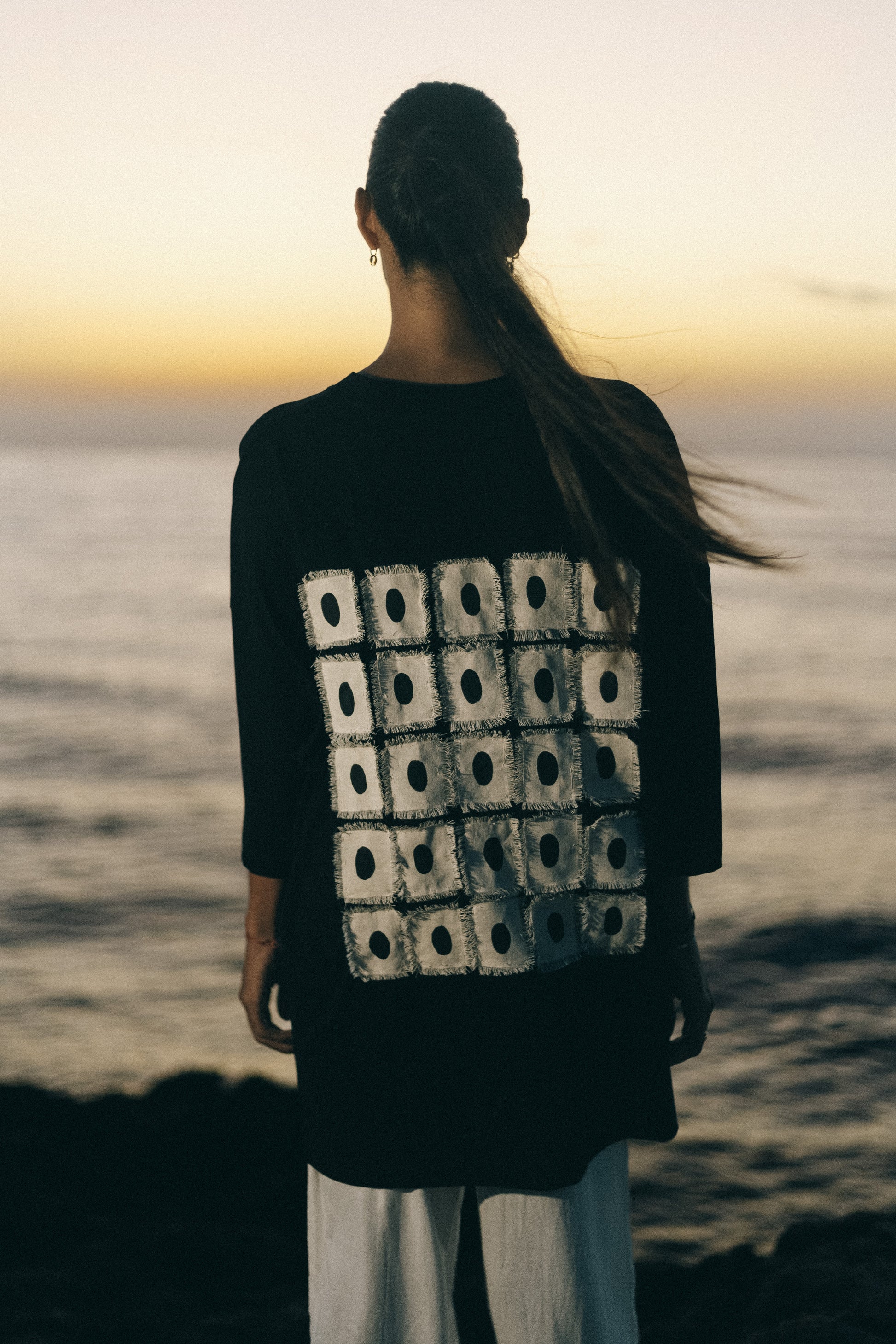 OVERSIZE BLACK T-SHIRT WITH HAND-STICHED ART PIECES.